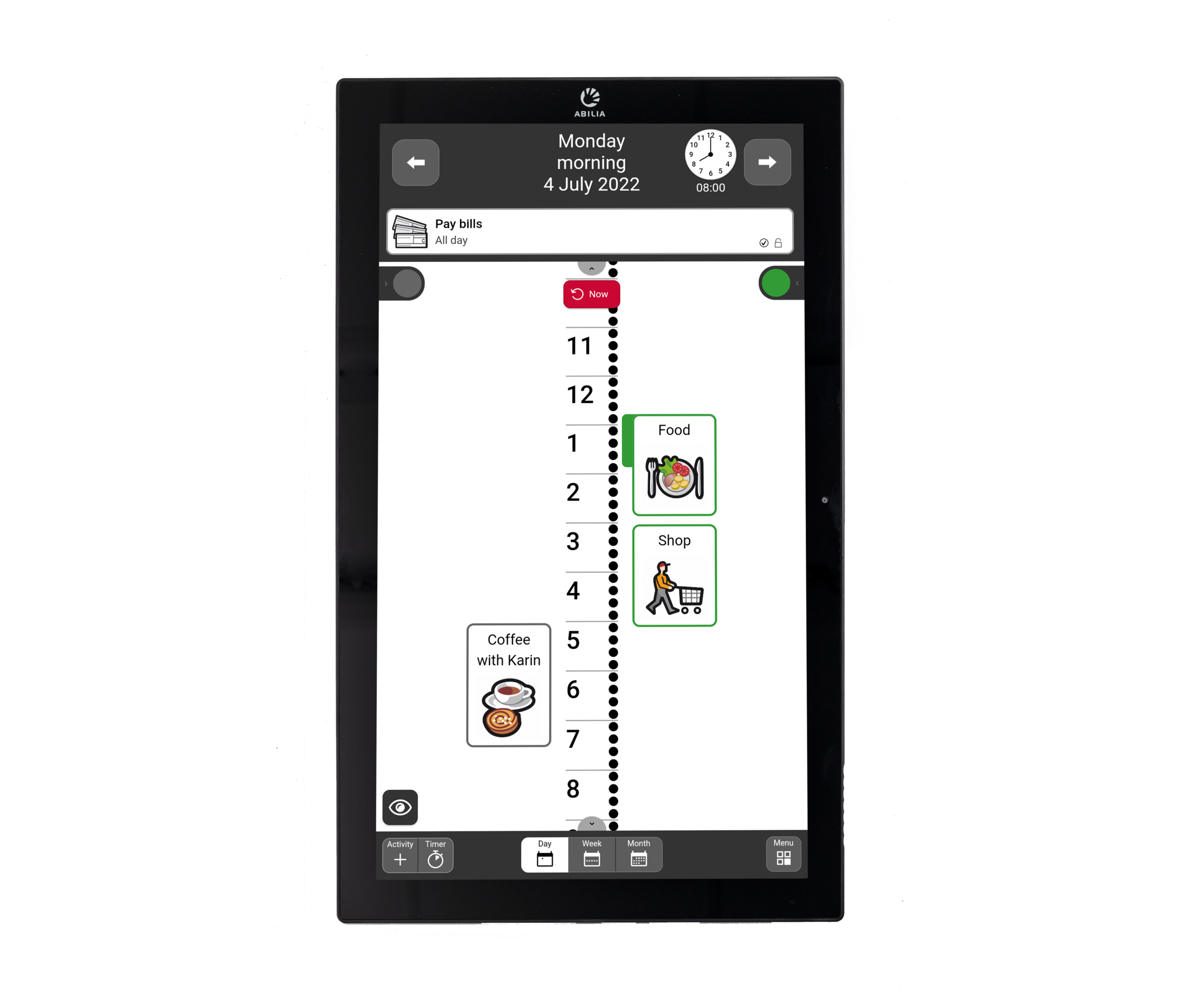 MEMOplanner Large tarjoaa laajat ja selkeät näkymät, jotka on jaettu kahteen erilliseen näyttöalueeseen, mahdollistaen esimerkiksi työ- ja henkilökohtaisten aikataulujen hallinnan rinnakkain. Aikajanan kulumista havainnollistaa visuaalinen osoitin, joka auttaa hahmottamaan päivän etenemistä. Päivä-, viikko- ja kuukausinäkymät tarjoavat kattavan yleiskuvan, ja automaattinen vuorokaudenajan näyttö mukauttaa näkymää selkeyttämään ajankulua.